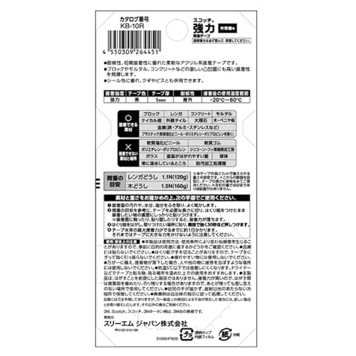 スリーエム(3M) 3M 両面テープ 強力 外壁面用 幅10mm 長さ1.5m スコッチ KB-10R 小巻 コンクリート ブロック べニア板