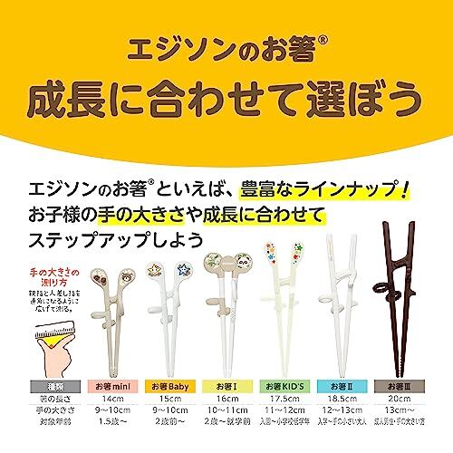 対象月年齢:入学〜手の小さい大人。材質(お箸本体):ABS樹脂(耐熱温度:90℃)、リング:シリコーンゴム(耐熱温度:170℃)。サイズ/重量(お箸):50×35×185mm/19g、リング内径:14mm。生産国:韓国。