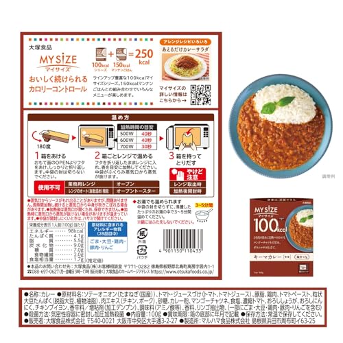 ~マイサイズで健康的な毎日に~ 100kcalマイサイズ おいしく続けられるカロリーコントロール フタをあけ、箱ごとレンジで簡単調理 ひき肉の旨みに完 熟トマトのコクとマンゴーチャツネの甘み、ガラムマサラ仕立て。