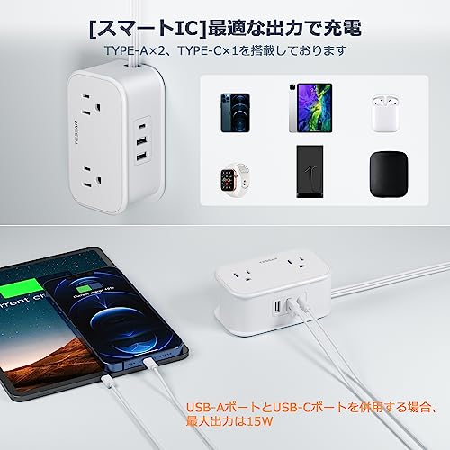 スマートIC:蛸足コンセントのUSB-Aポートは最大 5V/2.4A出力を対応し、デバイスに最適な電流を流す「スマート IC」により、安全に充電できます。また、type-cポートを搭載して、出力は5V/3A で、充電をより便利にします。