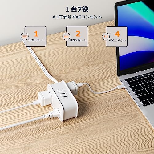 1台7役USB-C付き電源タップ:4個AC差込口、1つType-Cポートと2つUSB-A 1ポートを搭載し、最大7台デバイス同時に充電可能です。また、ACコンセントが前後に分散しているため、使用時に干渉を防ぎながら接続可能です。