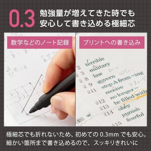 芯の減り具合に合わせて先端パイプがスライド。芯を守りながら書き進められるから、極細芯でも折れません。