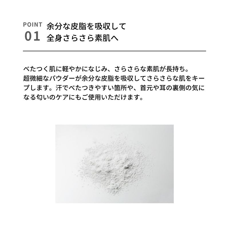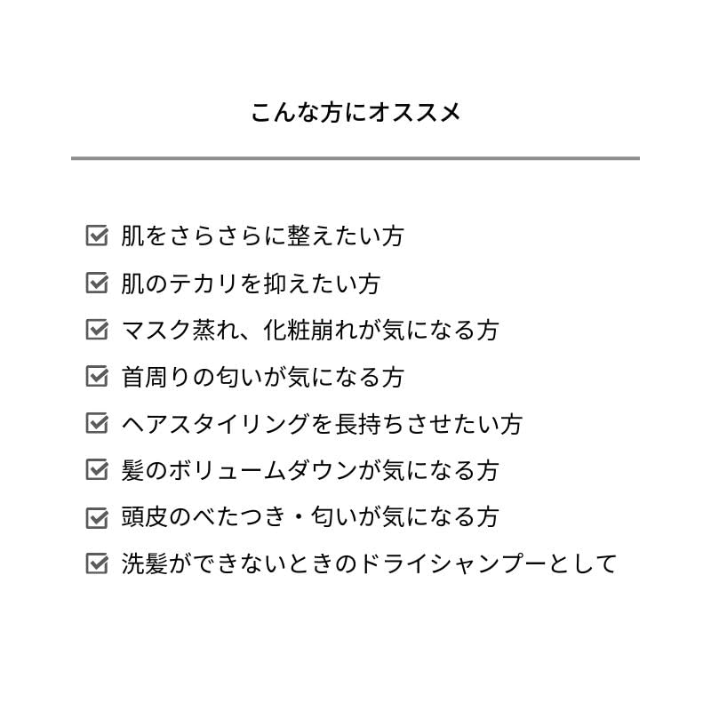 【こんな方・こんな時に特にオススメ】●肌をさらさらに整えたい時 ●肌のテカリを抑えたい時 ●マスク蒸れ、化粧崩れが気になる方 ●首周りの匂いが気になる時 ●ヘアスタイリングを長持ちさせたい時 ●髪のボリュームダウンが気になる方 ●頭皮のべたつき・匂いが気になる方 ●洗髪ができない時のドライシャンプーとして