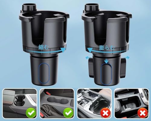 【インストールが簡単】カップホルダーのつまみを車やトラックのカップホルダーに合わせて調整します。車の電話ホルダーの背面にある調整ボタンを使用すると、幅を簡単に調整できます。カップホルダーとしてだけでなく、スマートフォンホルダーとしてもお使いいただけます。 用途が広く、とても便利です。