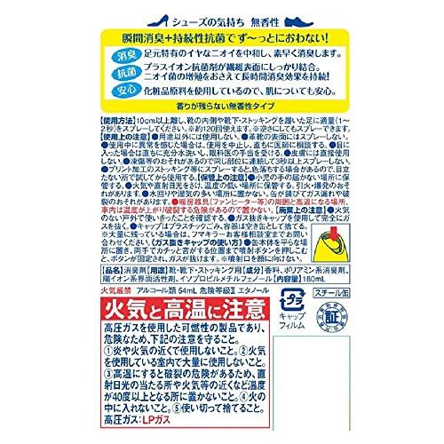 足もとを瞬間消臭&ずっとにおわない 靴の着脱時やニオイが気になったときにシュッとスプレー。 フマキラーの独自処方で、プラスイオン抗菌剤がニオイ菌の増殖を抑え、消臭効果が長時間持続。 優れた速乾性。さらっと乾くので、靴下やストッキングにも使えます。 内容量:180ml