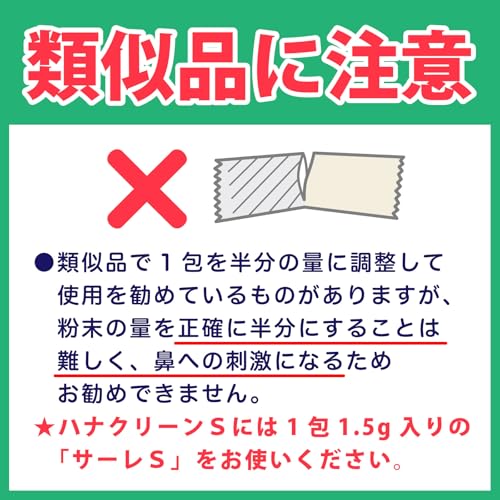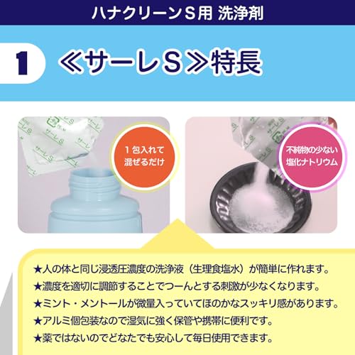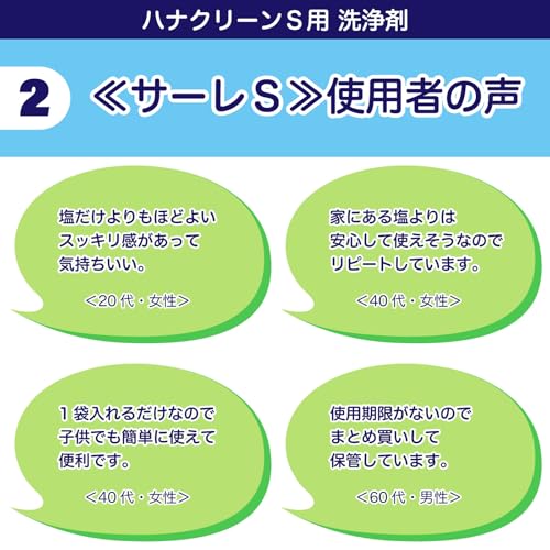 内容量: 1.5g×50包(50回分) 内容成分: 塩化ナトリウム・メントール・ペパーミント 製造国: 日本 対応機種:ハナクリーンS ブラント名: ハナクリーン