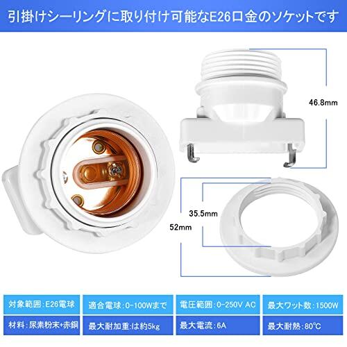 1、引掛けシーリングに取り付け可能なE26口金のソケットです、包装:1個入り、色:白い、サイズ(CM):高さ4.4×幅2.4×全長5.2、材質:尿素粉末+赤銅、本体重量:40g/1個。