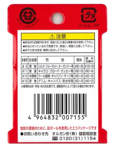 オルガン針 ORGAN NEEDLES 家庭用ミシン針Eカラー HA×1 #14 中厚生地用