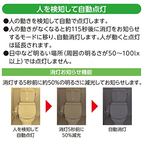 【 特 長 】● 人の動きを検知して自動で点灯します● 人の動きがなくなると約2分後に自動消灯します● 周囲が明るい場所(50~100ルクス以上)では点灯しません● 消灯する5秒前に約50%減光してお知らせします● 白熱電球40W形相当の明るさ● 電球色● 口金 E26
