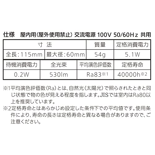 【 仕 様 】 寸法:全長115mm、最大径60mm 質量:54g 定格消費電力:5.1W 待機消費電力:0.2W 全光束:530 lm 平均演色評価:Ra83 定格寿命:40000h 屋内用(屋外使用禁止)