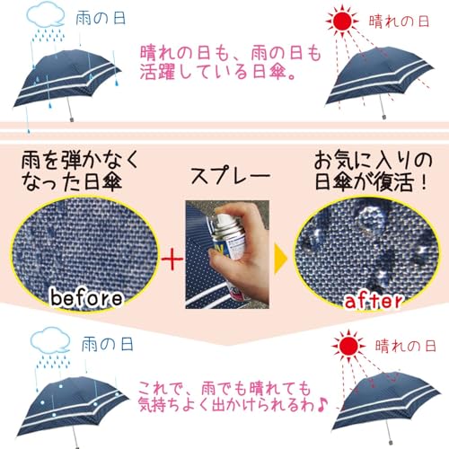 スプレーするだけで強力紫外線をブロックし色アセ防止します。 雨・雪・油ヨゴレを強力に弾く 衣類・布製品にシュっとひと吹きでいろんなところに使えます。