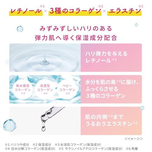 成分:水、グリセリン、BG、トリエチルヘキサノイン、ミリスチン酸ポリグリセリル-10、パルミチン酸レチノール、水溶性コラーゲン、加水分解コラーゲン、サクシノイルアテロコラーゲン、加水分解エラスチン、ヒアルロン酸Na、加水分解ヒアルロン酸、ヒアルロン酸クロスポリマーNa、セラミドNG、スクワラン、ローヤルゼリーエキス、グリセレス-26、ポリグリセリン-3、スクロース、ベタイン、アラントイン、PEG-400、エチルヘキシルグリセリン、ペンチレングリコール、コーン油、トコフェロール、ヒドロキシアセトフェノン、塩化Na、リン酸Na、リン酸2Na、クエン酸、クエン酸Na、カルボマー、キサンタンガム、(アクリレーツ/アクリル酸アルキル(C10-30))クロスポリマー、水酸化K、ステアリン酸ソルビタン、ジメチコン、ペンテト酸6Na、ポリビニルアルコール、フェノキシエタノール、メチルパラベン、プロピルパラベン