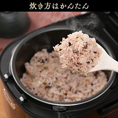 原材料:もち麦(カナダ又はアメリカ)、とうもろこし、黒米(国産)、もちきび、白麦、もちあわ、黒大豆、小豆、赤米(国産)、たかきび、キヌア、うるちひえ、アマランサス、白ごま、黒ごま、カニワ