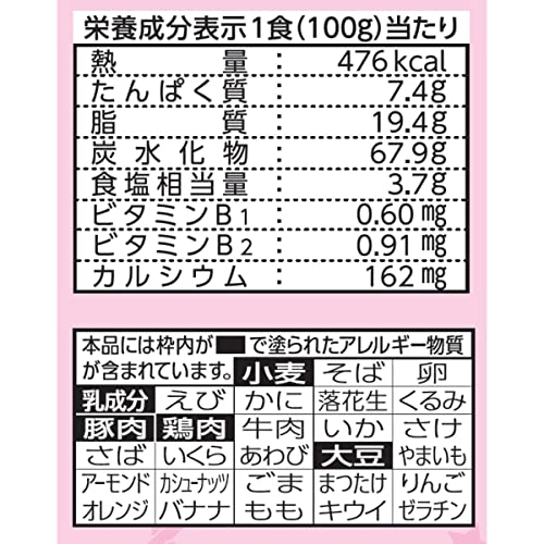 (1食(100g)当たり)エネルギー:476kcal、たんぱく質:7.4g、脂質:19.4g、炭水化物:67.9g、食塩相当量:3.7g、ビタミンB1:0.6mg、ビタミンB2:0.91mg、カルシウム:162mg