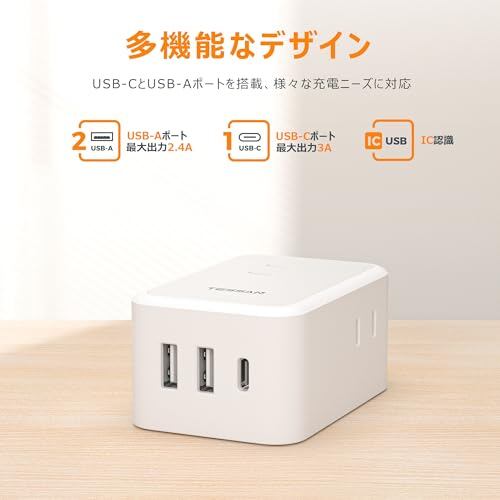 延長コード 2m 薄型 電源タップ usb コンセントタップ たこあしコンセント テーブルタップ TESSAN 3個AC 1個タイプC 2個タイプA 電源コード type-c タコ足配線 隙間