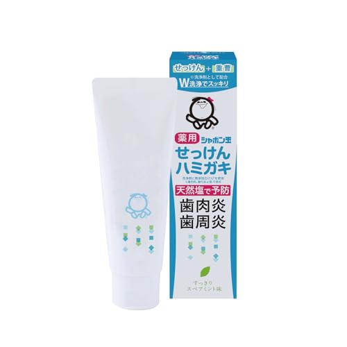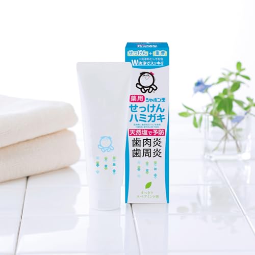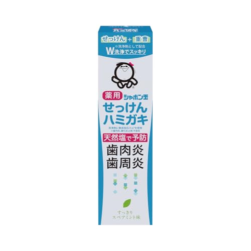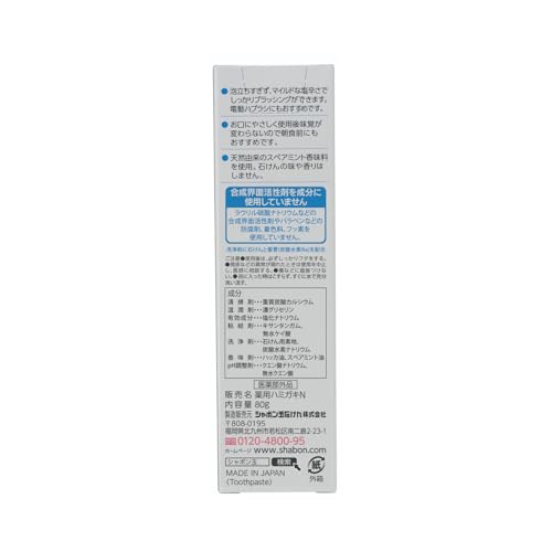 成分 : 重質炭酸Ca[清掃剤]、濃グリセリン[湿潤剤]、塩化Na[有効成分]、キサンタンガム、無水ケイ酸[粘結剤]、石けん用素地、炭酸水素Na[洗浄剤]、香料(ハッカ油、スペアミント油)[香味剤]、クエン酸Na、無水クエン酸[pH調整剤]