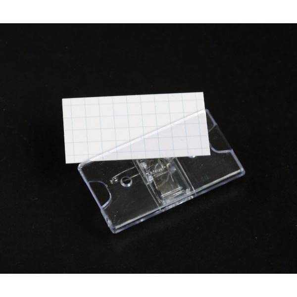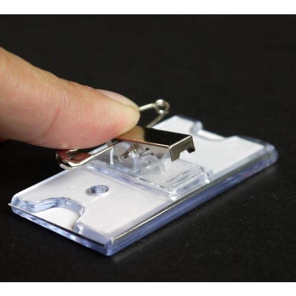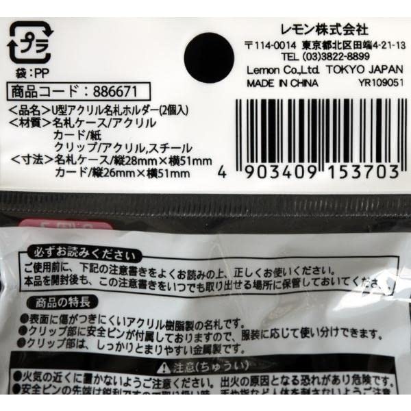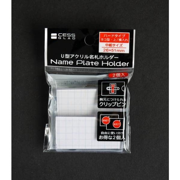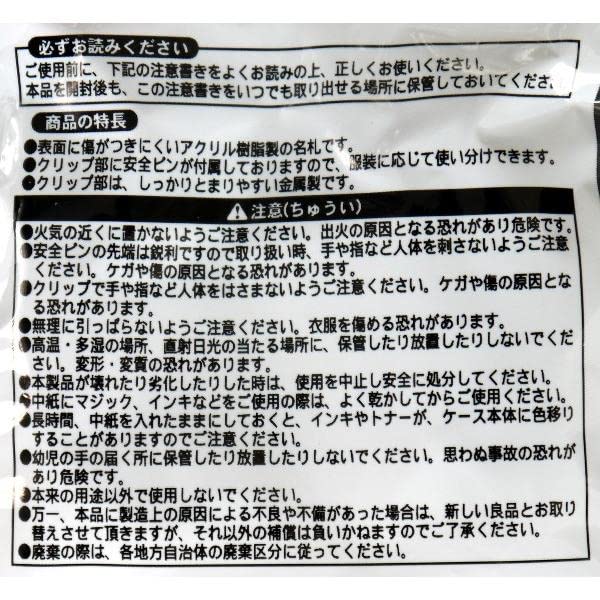 ミニサイズ(幅約52mm)の名札、2個入りです。安全ピンとクリップ付です。表面に傷がつきにくいアクリル樹脂製の名札です。横型の、しっかりとしたハードタイプです。名前を書くカードを上や横から抜き差し出来ます。クリップ部に安全ピンが付属しており、服装に応じて使い分ける事ができます。クリップ部はしっかりした金属製です。