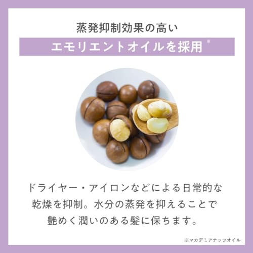 エモリエントオイル配合で日常的な髪の乾燥を抑制。水分の蒸発を抑えることで艶めく潤いのある髪に保ちます