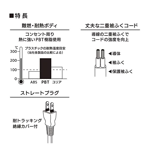 【 特 長 】 難燃・耐熱ボディ:コンセント周りに熱に強いPBT樹脂使用