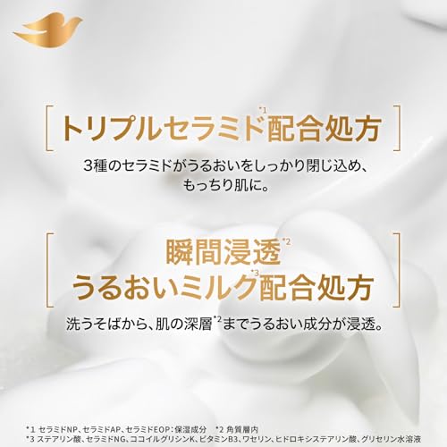 【point3】瞬間浸透*² うるおいミルク*³、トリプルセラミド*⁴ 配合 だから、お風呂上りもうるおい続く。 *² 角質層内 *³ ステアリン酸、セラミドNG、ココイルグリシンK、ビタミンB3、ワセリン、ヒドロキシステアリン酸、グリセリン水溶液:うるおい成分 *⁴ セラミドNP、セラミドAP、セラミドEOP:保湿成分