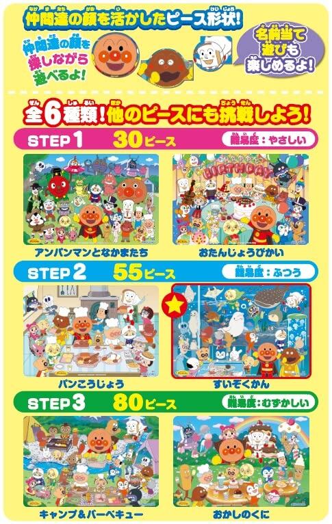 同シリーズでSTEP1:30ピース(アンパンマンとなかまたち・おたんじょうびかい)、STEP3:80ピース(キャンプ&バーベキュー・おかしのくに)があります。