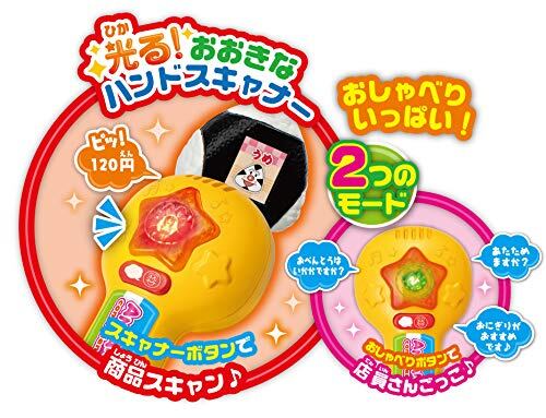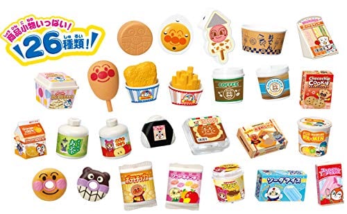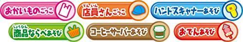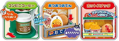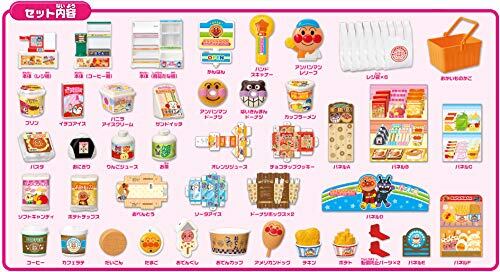 付属:本体(レジ側/コーヒー側/商品だな側)、ハンドスキャナー、アンパンマンレリーフ、アンパンマンドーナツ、ばいきんまんドーナツ、サンドイッチなどの小物×24、おかいものかご、レジ袋×6、ドーナツボックス×2、かんばん、パネル×6、転倒防止パーツ×2