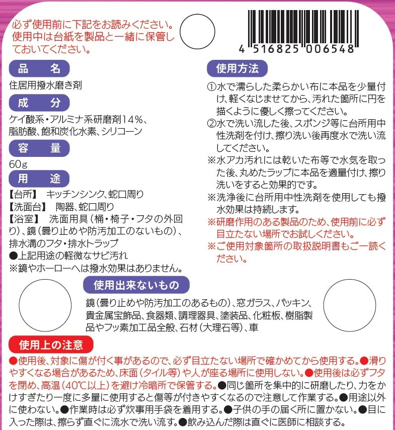 原材料: ケイ酸系、アルミナ系研磨剤14%、脂肪酸、飽和炭化水素、シリコーン