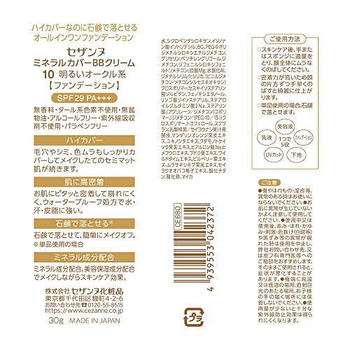 セザンヌ ミネラルカバーBBクリーム 10 明るいオークル系 30g ハイカバー クリームタイプ ウォータープルーフ