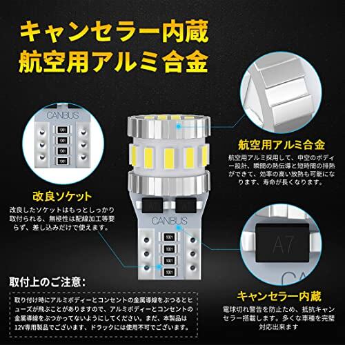 【T10 LED 商品仕様】消費電力:2.5W/色温度:6000K/色:ホワイト/LEDチップ: SMD3014チップ/電圧:DC12V/ルーメン:片方288LM。CANBUSキャンセラー内蔵で大部分車種はエラーフリー。まだ、本製品は12V専用製品でございます、ドラックには使用不可でございます。また、トヨタプリウスのナンバー灯として、ソケットの形状が違うた為に、取付不可でご注意ください。ご確認の上、ご購入お願い致します。