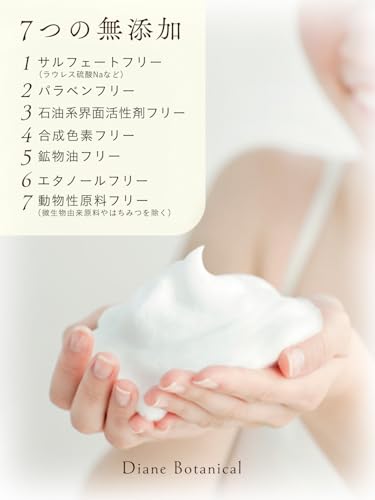 7つの無添加:サルフェートフリー(ラウレス硫酸Naなど)・エタノールフリー・パラベンフリー・鉱物油フリー・石油系界面活性剤フリー・合成着色料フリー・動物性原料フリー(微生物由来原料やはちみつを除く)