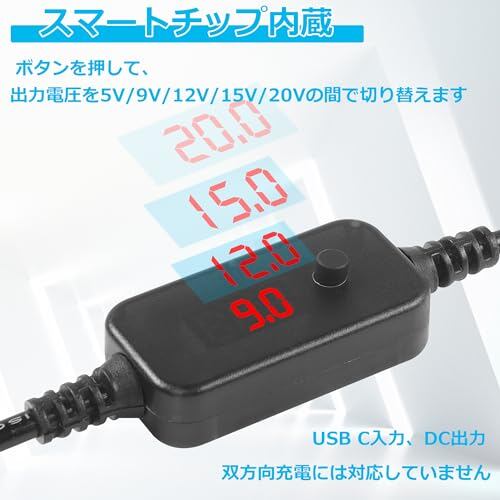 使用方法:ボタンを押して、出力電圧を5V/9V/12V/15V/20Vの間で切り替えます。