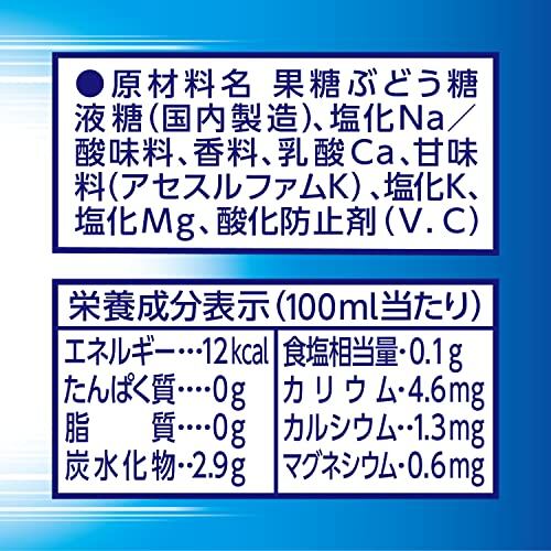 原材料:果糖ぶどう糖液糖、塩化Na、クエン酸、香料、クエン酸Na、乳酸Ca、甘味料(アセスルファムK)、塩化K、塩化Mg、酸化防止剤(V.C)
