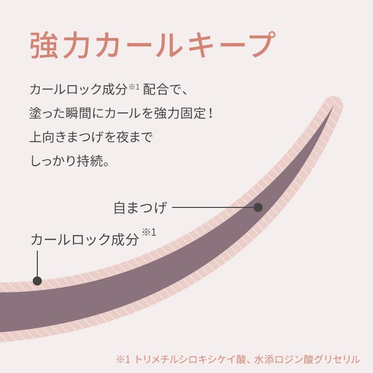 【夜までメイクしたてのようなまつ毛をキープ】 カールロック成分配合でカールを下げることなく一日中しっかりキープウォータープルーフ処方なので、汗や雨にも負けずにじみにくい