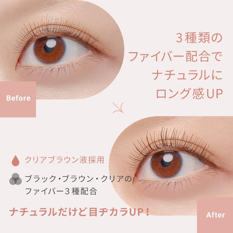 【ナチュラルだけど目ヂカラUP】 ブラック・ブラウン・クリアのファイバー3種を配合で印象的なロングまつげに。 また、さりげなく色づくクリアブラック液で、抜け感のある仕上がりに
