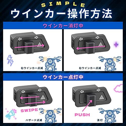 【操作方法】 スイッチの左が左ウィンカー、右が右ウィンカー、スイッチを左右にスワイプするとハザードになります。押し込むとウィンカーが消灯します。(プッシュキャンセル式)