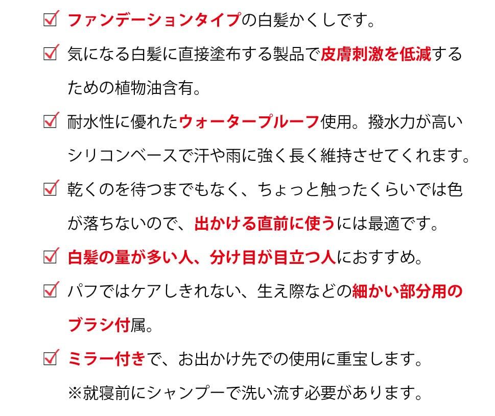 白髪をサッと隠すお出かけ前にパフで塗るだけで自然な感じの仕上がりに。細かい部分用のブラシ付。