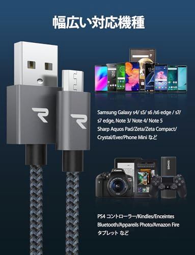 【2M/黒】マイクロ usb ケーブル Rampow Micro USB ケーブル QC3.0急速充電 高速データ転送 ps4コントローラー充電器 Android多機種スマホ対応 android充電ケーブル usbケーブル ps4 充電ケーブル