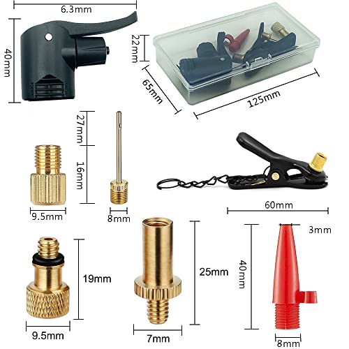 【パッケージ内容】自転車空気入れのバルブ変換アダプター(1 X バルブクリップ、1X 真鍮弁自転車バルブ、仏式1個 / 英式1個 / 米式3個、1 X ボール用空気針、1 X 付きインフレータブルノズル、2 X ブラックコーンアダプター) + 1 X ポータブル収納ボックス。