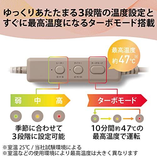 「弱・中・強」3段階の温度設定の他に、最高温度で10分間運転するターボモードを搭載。寒い時に素早くお尻や足元を温めます。低温やけど防止のため、10分経過後は自動で「強」に切り替わります。