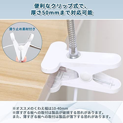 【強力クリップ】クリックの最大くわえ幅約50mmです。挟む部分に滑り止め素材が付き、机の端やベッドの枠などにもしっかり固定できます。