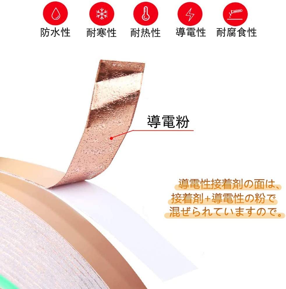 2.両面導電性:両面とも導電性がありますので、貼るだけで粘着面と金属テープ表面が導電します。銅テープは電導率が極めて高く、アルミテープよりも体感で倍くらいの効果を得られます。