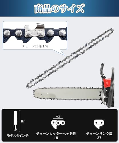 【製品仕様】サイズ:6インチチェーン、材質:65Mn、規格:37Eチェーンリンク・18Tカッター、パッケージ内容:4本入り。チェーンが2つ付いているので、予備のチェーンを残すことができて、とても便利で手頃な価格です。