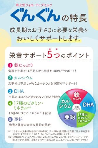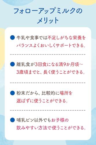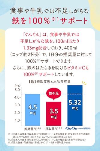 離乳食が3回食になる満9か月頃からの成長期に、牛乳や食事では不足しがちな栄養をおいしくサポートするミルクです。牛乳では摂りにくいDHAを配合し、1日に400ml飲むことで鉄・カルシウム・ビタミンC・ビタミンDは食事摂取基準1〜2歳の推奨量・目安量に対して1日分を100%サポートし、発育に大切な亜鉛を新たに配合しました。