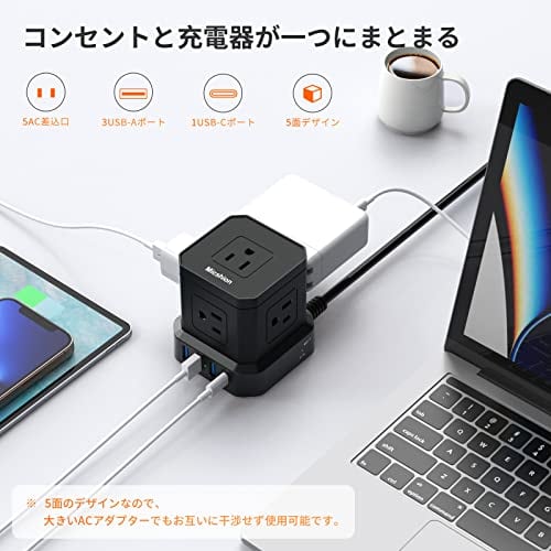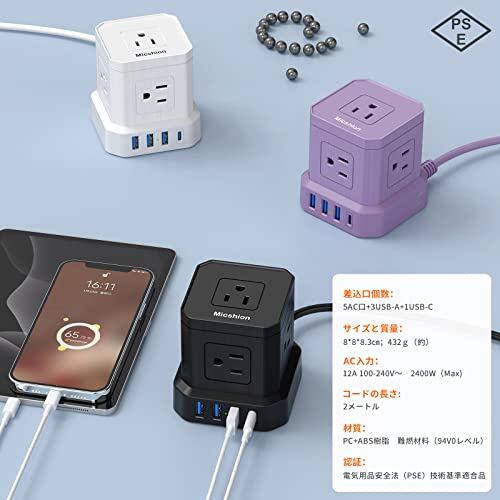 Micshion キューブ型電源タップ Type-C付 延長コード 2m 雷ガード 5個AC口(2400W) 3個USBポート 1個Type-C コンセントusb付き 電源タップ usb付き タコ足配線 テーブルタップ たこあしコンセント マルチタップ 安全保護機能 自宅用 会社用 ブラック