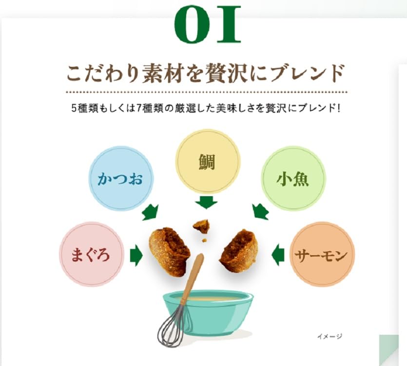まぐろとかつお、淡白な味わいの鯛、こだわりのサーモンと小魚。厳選した5種の食材を絶妙にブレンド