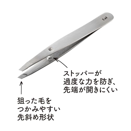【つまむ部分はより毛をつかみやすい形状に】毛をしっかりとつかめるように、先端は斜めの形状に設計しています。毛が密集している箇所でも、狙った毛を一本一本キャッチしやすく、眉毛や産毛のお手入れなどにも便利です。