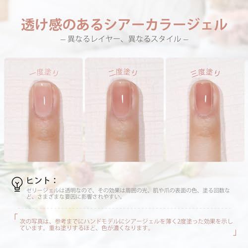 4週間長持ち: ベースジェルを塗る前に爪の表面を磨くと、良いテクスチャーを作ります。カラージェルの後にトップジェルを塗ると、ツヤのある仕上がりになります。