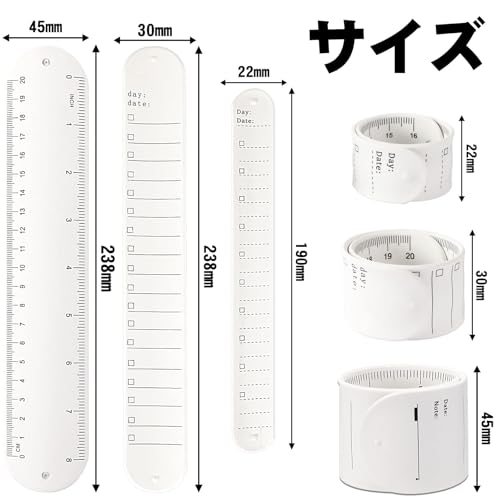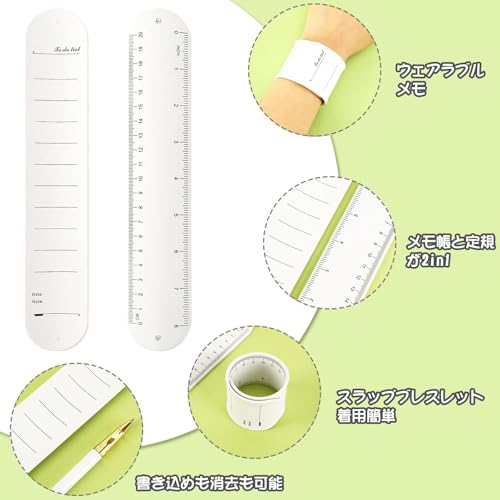 定規デザイン:手首に巻くメモの裏は定規のデザインを採用して、フートやセンチメートル二つの測定単位があるので、自分のニーズによって選んで使います。例えば、数学、物理や理工系を勉強している学生、あるいは工事現場で物体を測ったり図を描いたりする社員は勉強中と仕事中で定規を使いながら腕でメモを書けます