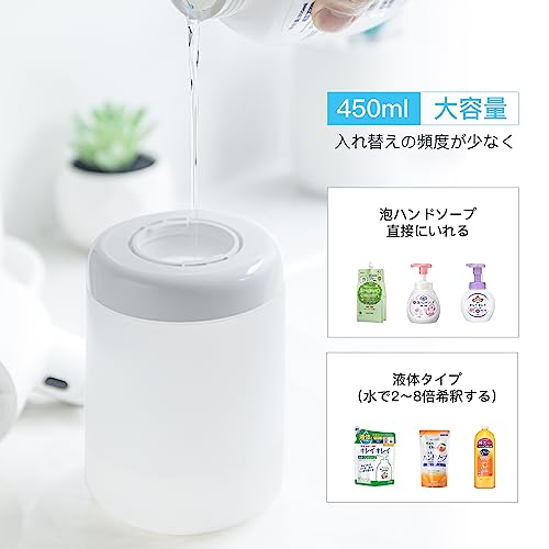 「450ml大容量・詰め替え簡単」:大容量の450ml透明タンクを搭載しているため、頻繁に補充する必要がありません。透明ボトルなので、液体石鹸の残量がひと目でわかります。泡ハンドソープはもちろん、食器用洗剤を2~6倍の水で薄めれば使用できます。