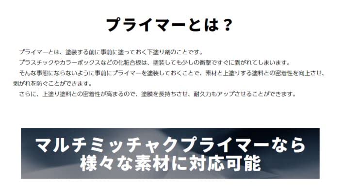 【用途】プラスチック(PE、PP、ABS樹脂、PET)、FRP、ガラス、アクリル板、亜鉛メッキ・アルミ・ステンレス・ガルバリウム・クロームメッキ・人工木など塗料の密着の悪い金属、鉄、銅、スチール、鉛・進駐、カラートタン、押出成形セメント板、サイディングボード、モルタル、ブロック、PC板、けい酸カルシウム板、ALC、住宅用化粧スレート屋根、GRC、化粧板、硬質塩ビ、木部、コンクリート・モルタルなどの幅広い素材。 素材の状況などによっては密着しない場合がありますので、必ず見えにくいところなどで試し塗りをしてください。